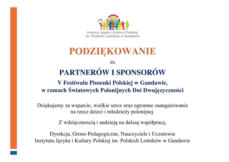 Z całego serca pragniemy podziękować PARTNEROM i SPONSOROM naszego pięknego, jubileuszowego V Festiwalu Piosenki Polskiej w Gandawie. Gościliśmy dzieci i młodzież polonijną wraz z rodzinami z Gandawy, Brukseli, Antwerpii, Leuven, Brugii, by po raz kolejny uczcić Polonijne Dni Dwujęzyczności i celebrować świeto języka polskiego za granicą. Do wspaniałej realizacji naszego przedsięwzięcia przyczynili się następujący partnerzy/sponsorzy:...