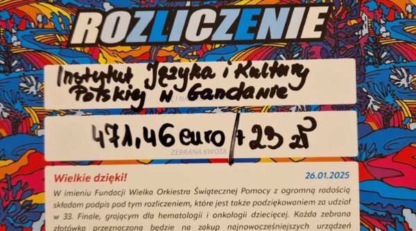 Z całego serca dziękujemy wszystkim uczniom, nauczycielom i rodzicom Instytutu Języka i Kultury Polskiej w Gandawie za udział w zbiórce WOŚP 2025 Dzięki wielkim, otwartym sercom, w sobotę 25 stycznia zebraliśmy 471,46 euro oraz 23 PLN. Za wylicytowane orzeszki dodatkowo do puszki online wpłynęło 70 euro. Serdecznie dziękujemy