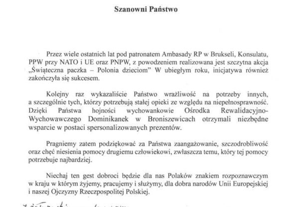 Oficjalne podziękowania za udział w akcji „Świąteczna paczka – Polonia dzieciom”.